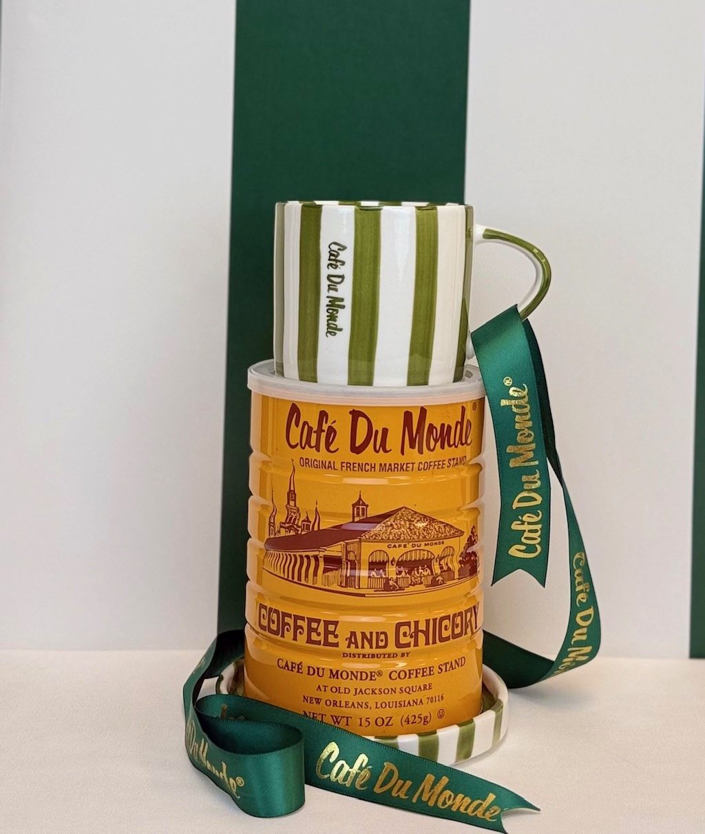 Gramercy Gift Wrap consists of one Can of Coffee and one Green Stripe Cup and Saucer set.