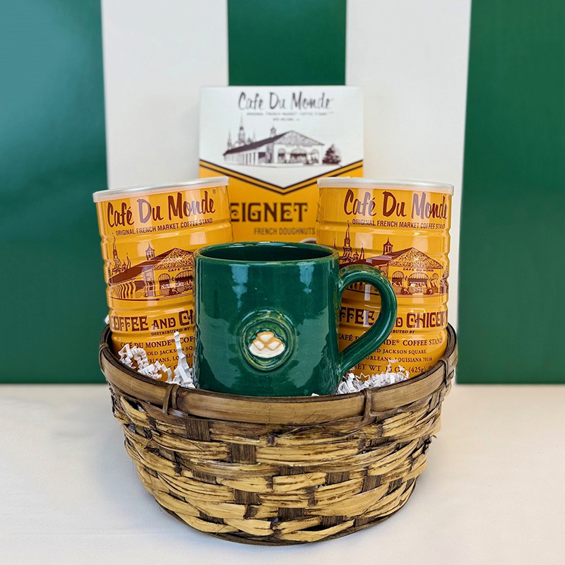 Old Metairie Gift Basket consists of two coffee of your choice, one Beignet Mix and a Beignets Peacock Mug.