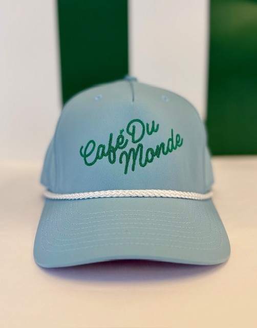 Cap with adjustable back, blue with green stitch.